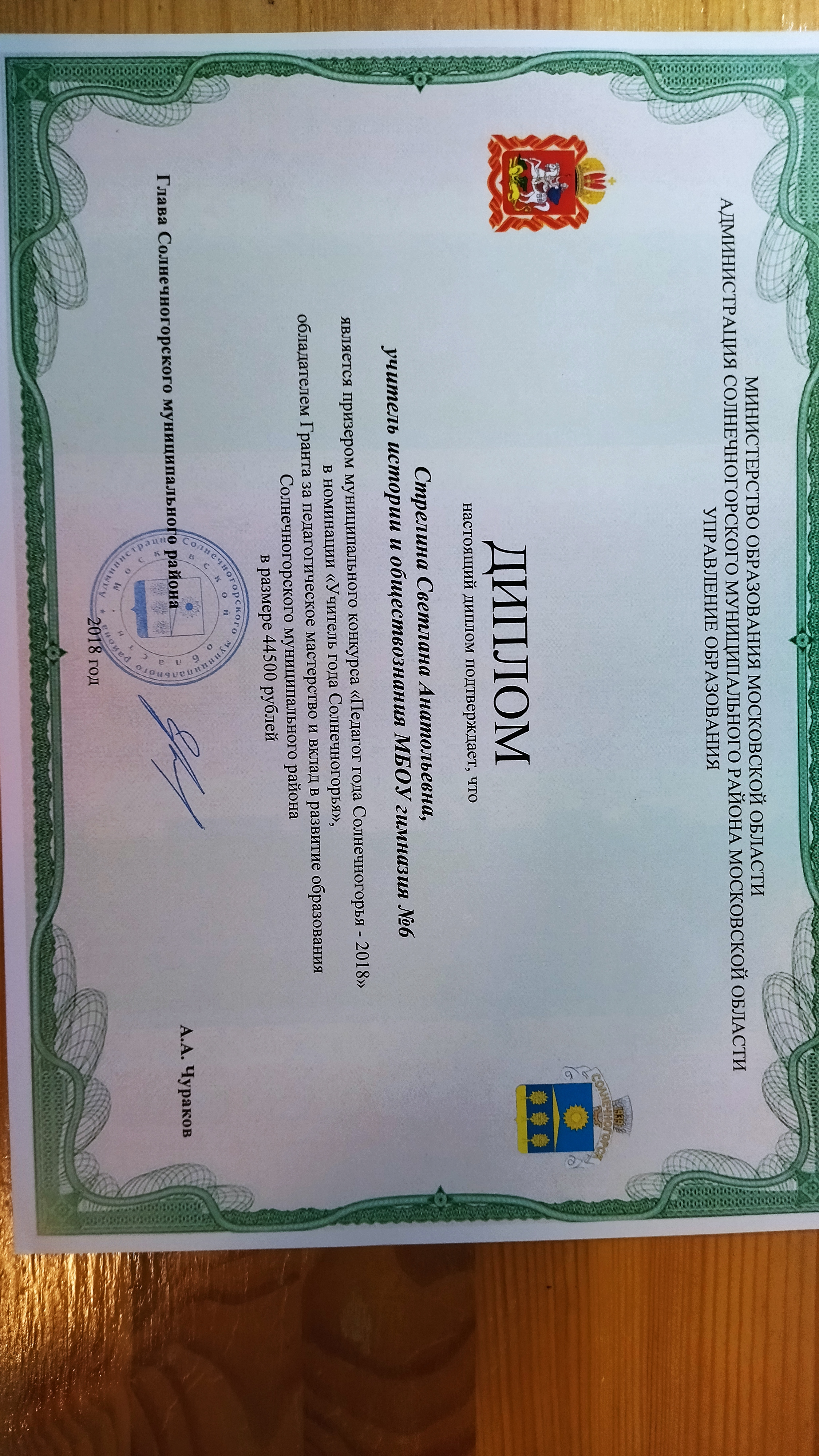 Диплом призер Педагог Солнечногорья - 2018