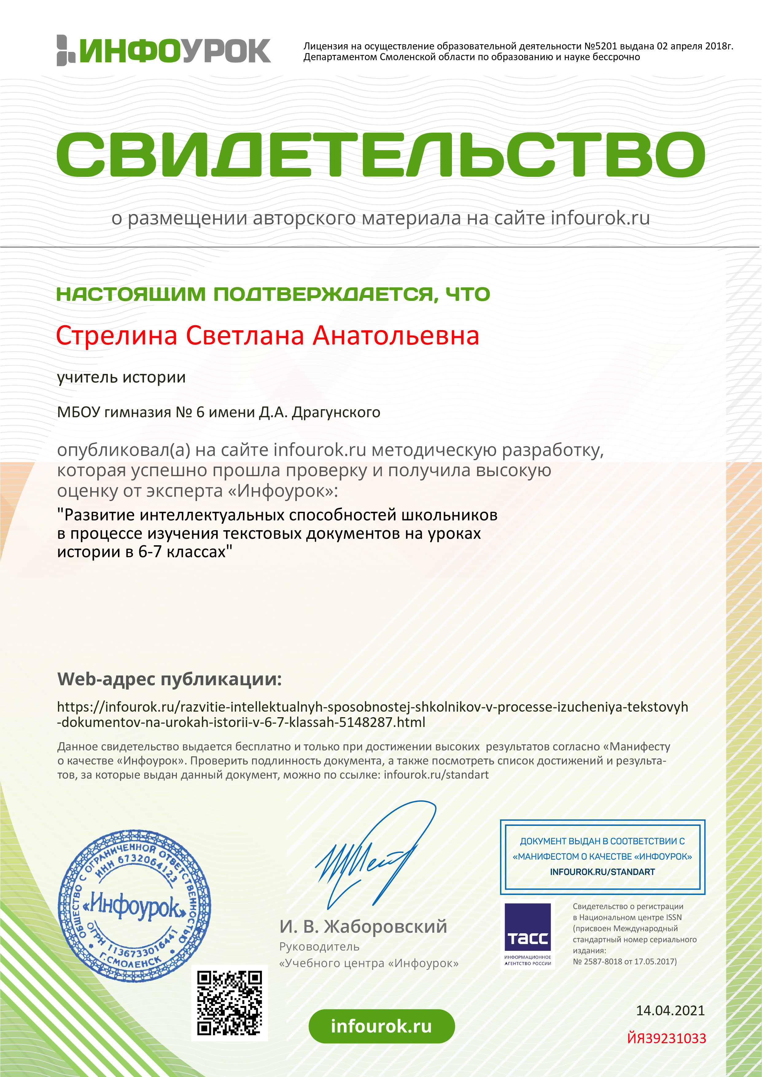 Свидетельство проекта infourok.ru №ЙЯ39231033.jpg (1157247)